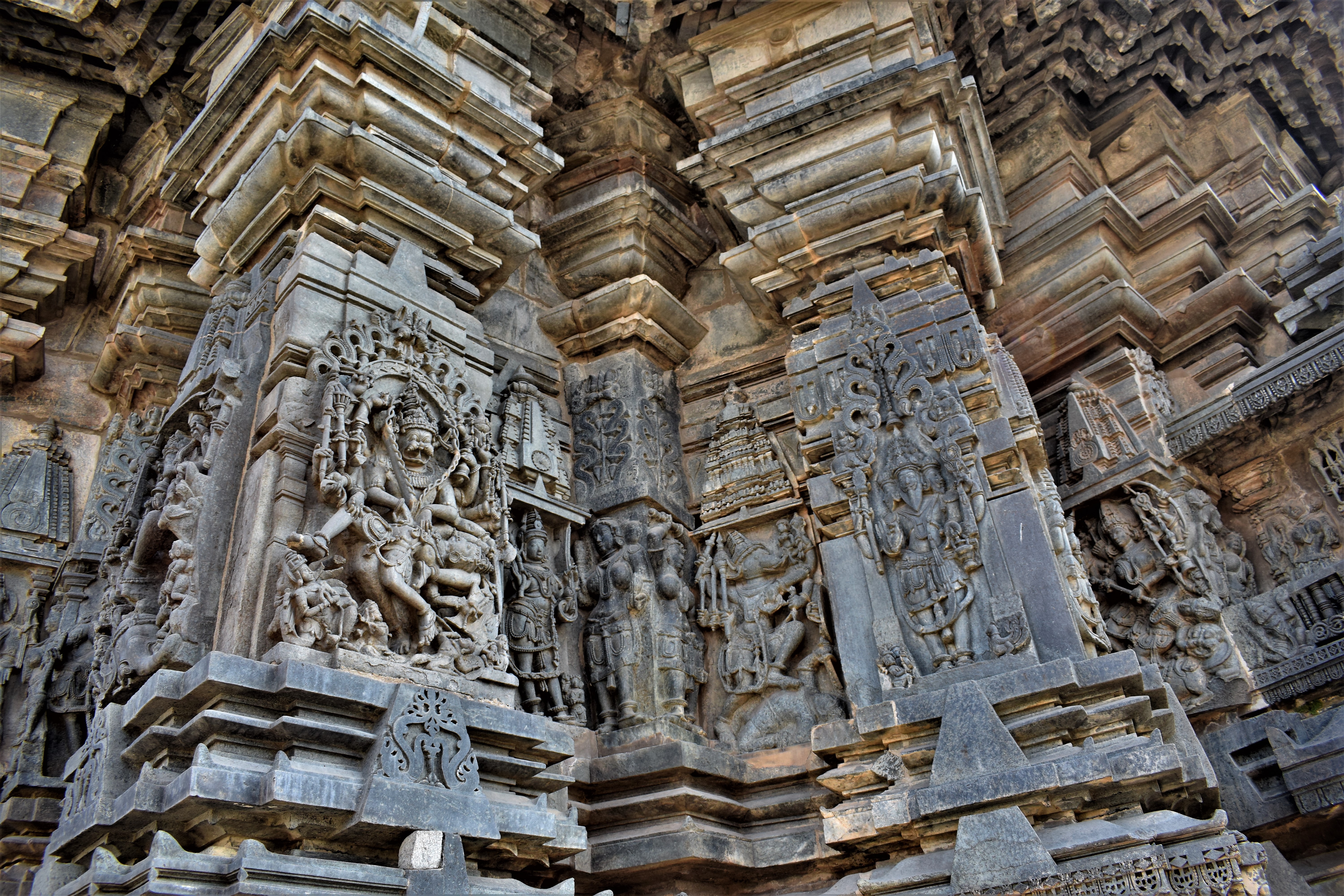 Chennakeshava temple, Beluru, wall reliefs around the sanctum, southern side, SW pillars, Brahma, Narasimha, Varaha Öffentlichkeit Deposited