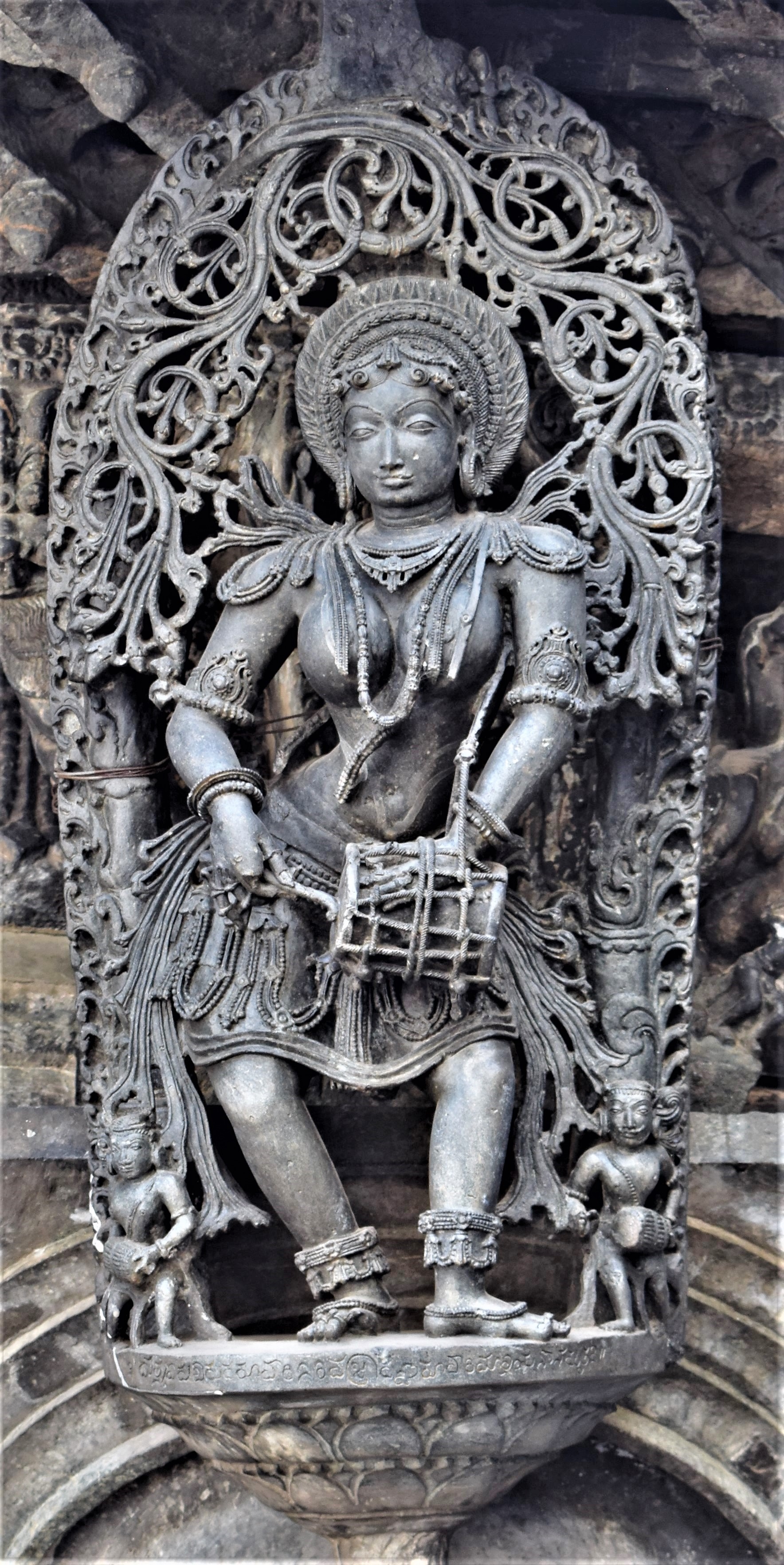 Chennakeshava temple, Beluru, Bracket figure - shilabalike - girl playing drums Öffentlichkeit Deposited