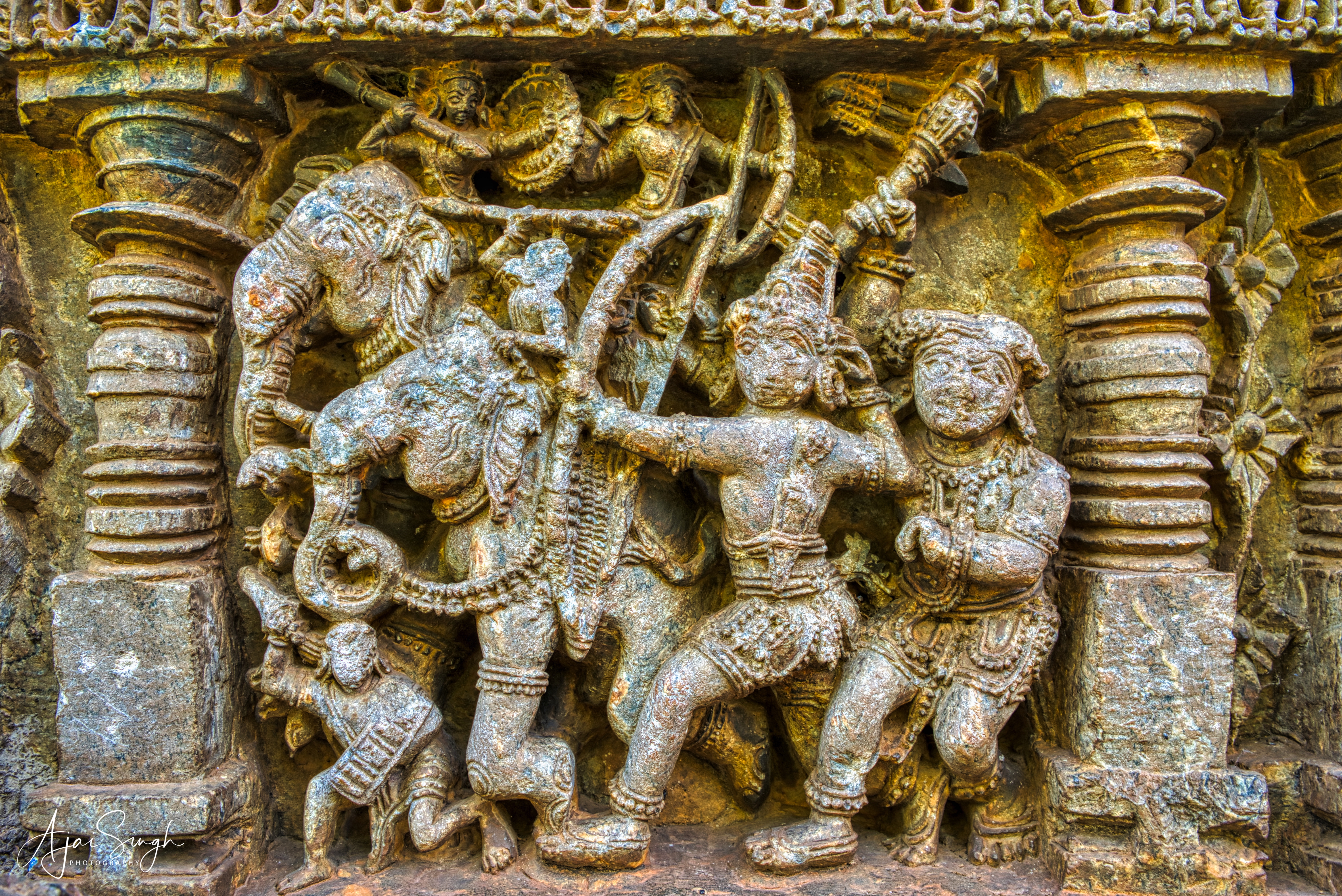 A elephant war scene from the Mahabharat, showing Arjuna (wearing a crown) with his famous bow, Gandiva, while Bhim wields his mace Público Deposited