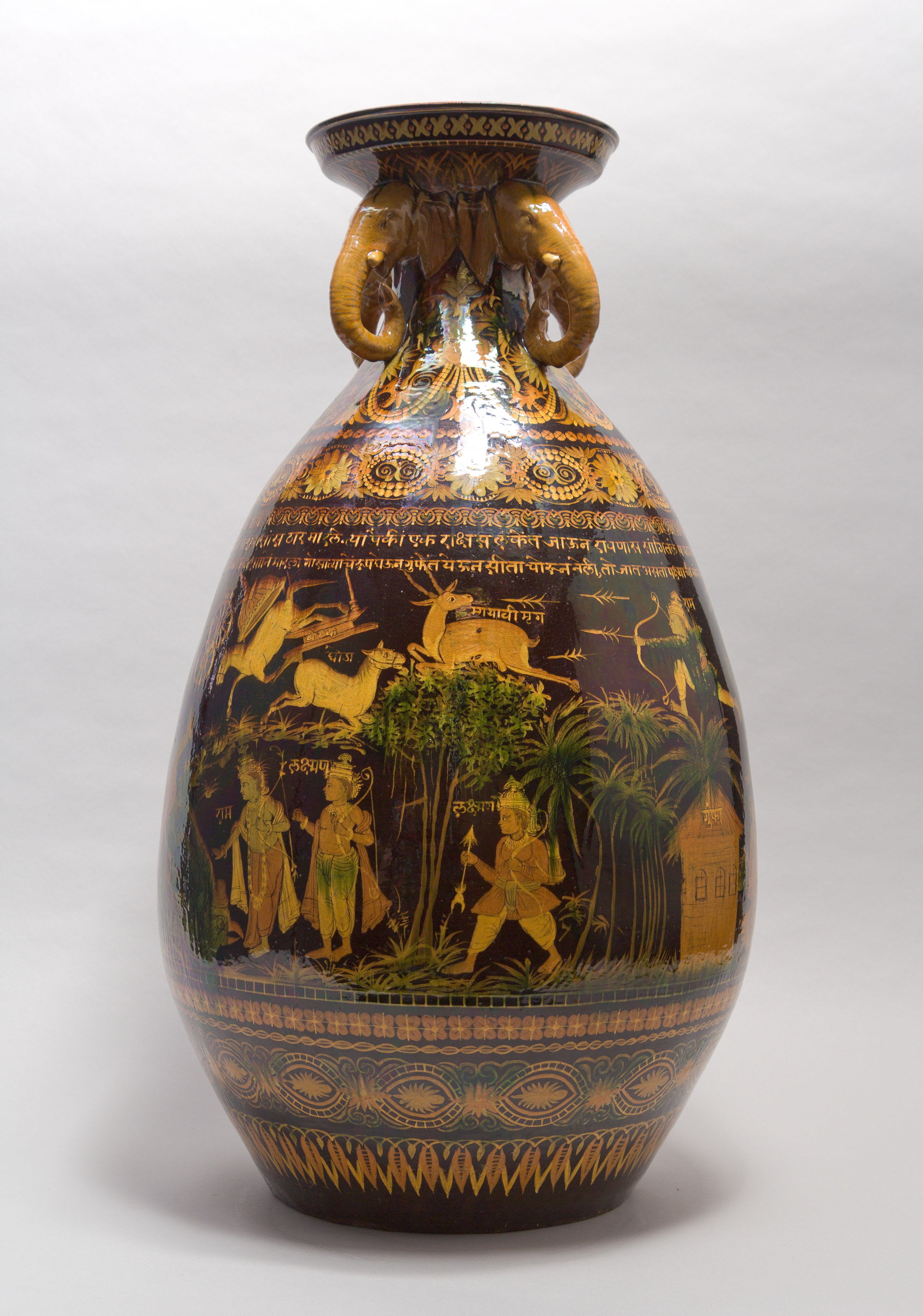Drawn from the third book (“Aranya Kanda”) of the Ramayana, the elaborate narrative on this vessel depicts key scenes in the Dandaka forest. Created by the Bombay School of Art in an effort to preserve Indian craft, the object features many embellishing motifs drawn from the Buddhist murals of Ajanta. These features include the lotus and pearl band running around the shoulder and the monster faces (kirtimukha), set between the addorsed elephant heads, that spit out a garland of jewels. Although the vase is grounded in the Indian tradition, British neoclassical taste clearly underlies its shape and some of its geometric motifs. Given the scale and inscribed multiscene narrative, this vase may have been produced for the London Colonial and Indian Exhibition of 1886.