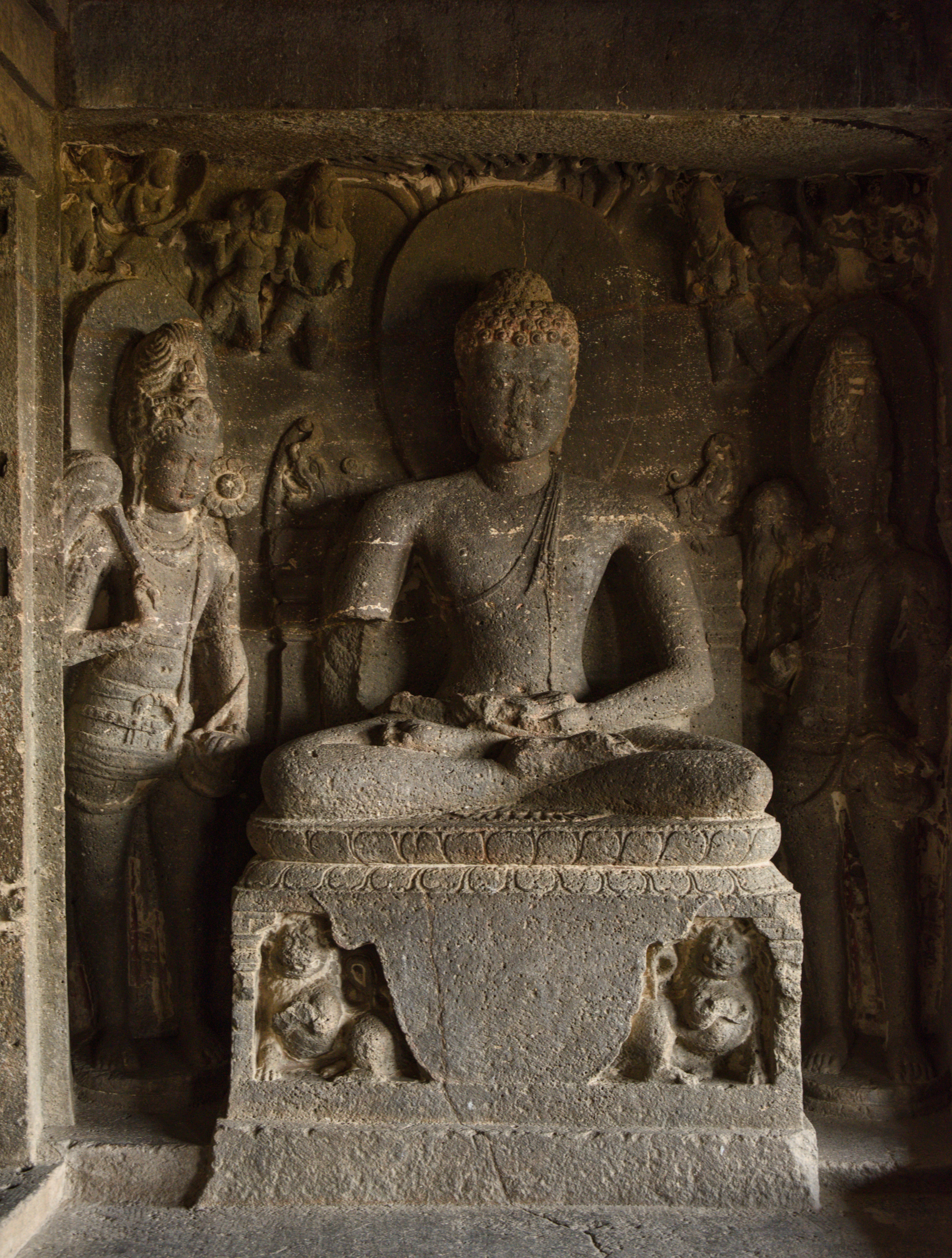 Ellora, Buddhist Architecture, Gautama Buddha with two attendants Öffentlichkeit Deposited