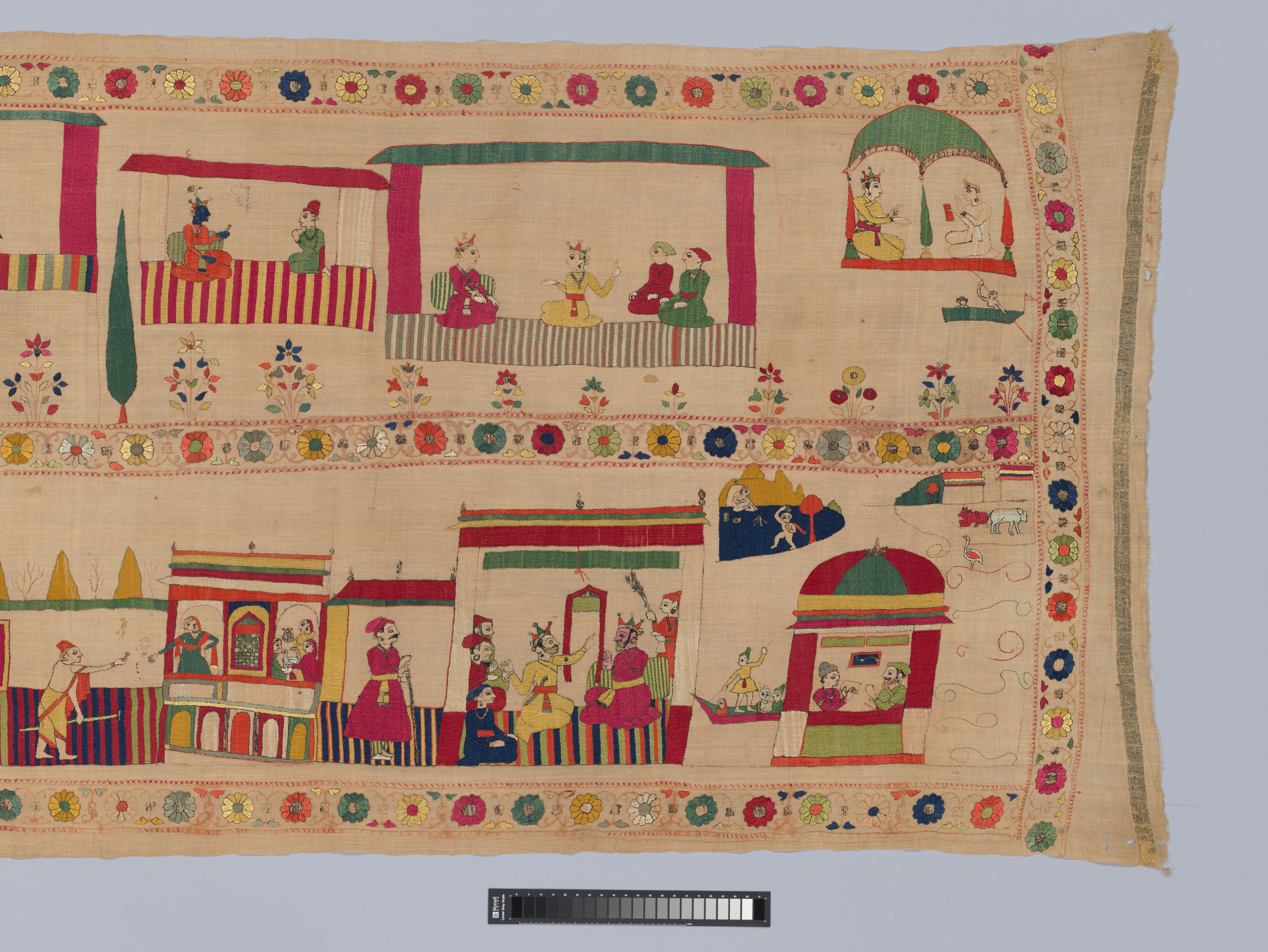 Image Courtesy: https://www.metmuseum.org/ Date: ca. 1800 According to the MET museum website, this banner was likely used in an annual festival commemorating Krishna’s marriage to his first wife, Rukmini, that is still celebrated today in parts of the Himalayan foothills. As the work was shown only periodically, the colors remain vivid. The brilliant hues were produced from vegetable dyes: red derived from cochineal and lac insects, blue and green from indigo plants, and orange from safflower. In contrast, the silk threads, which were bleached white or etched with mordant to enable black coloring to bond to the fibers, have disintegrated, making it possible to see the underdrawing. Painted in henna with details created in carbon black, the preparatory sketch served as the guide for the final embroidery. This technique is similar to that used to make preliminary sketches for paintings, which are also produced in red and black.