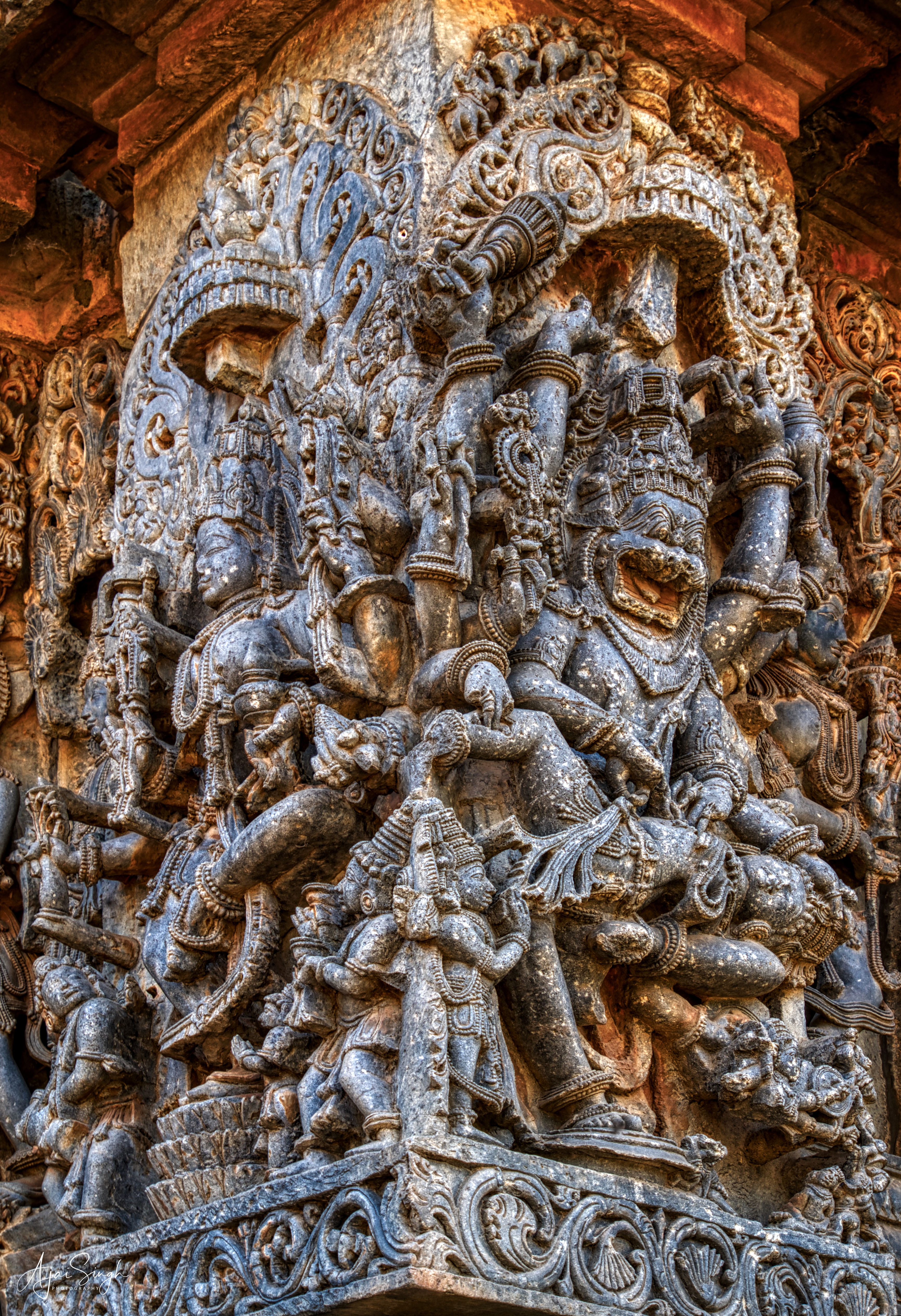 Twin sculptures at the corner - on the right is Narasimha - half-man-half-lion incarnation of Vishnu - 76