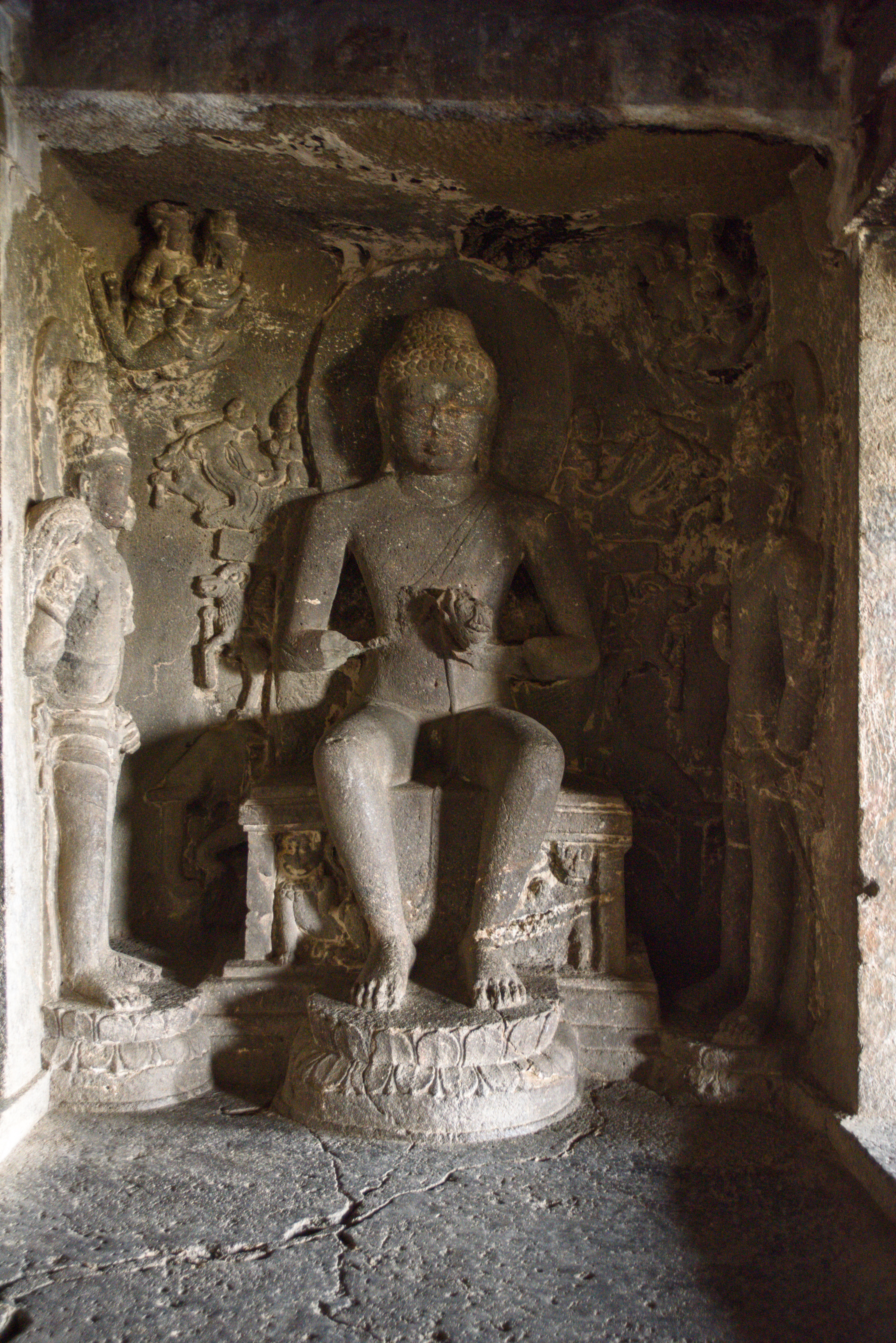 Ellora, Buddhist Architecture, Buddha seated on a throne depicting Dharmachakra Mudra Public Deposited