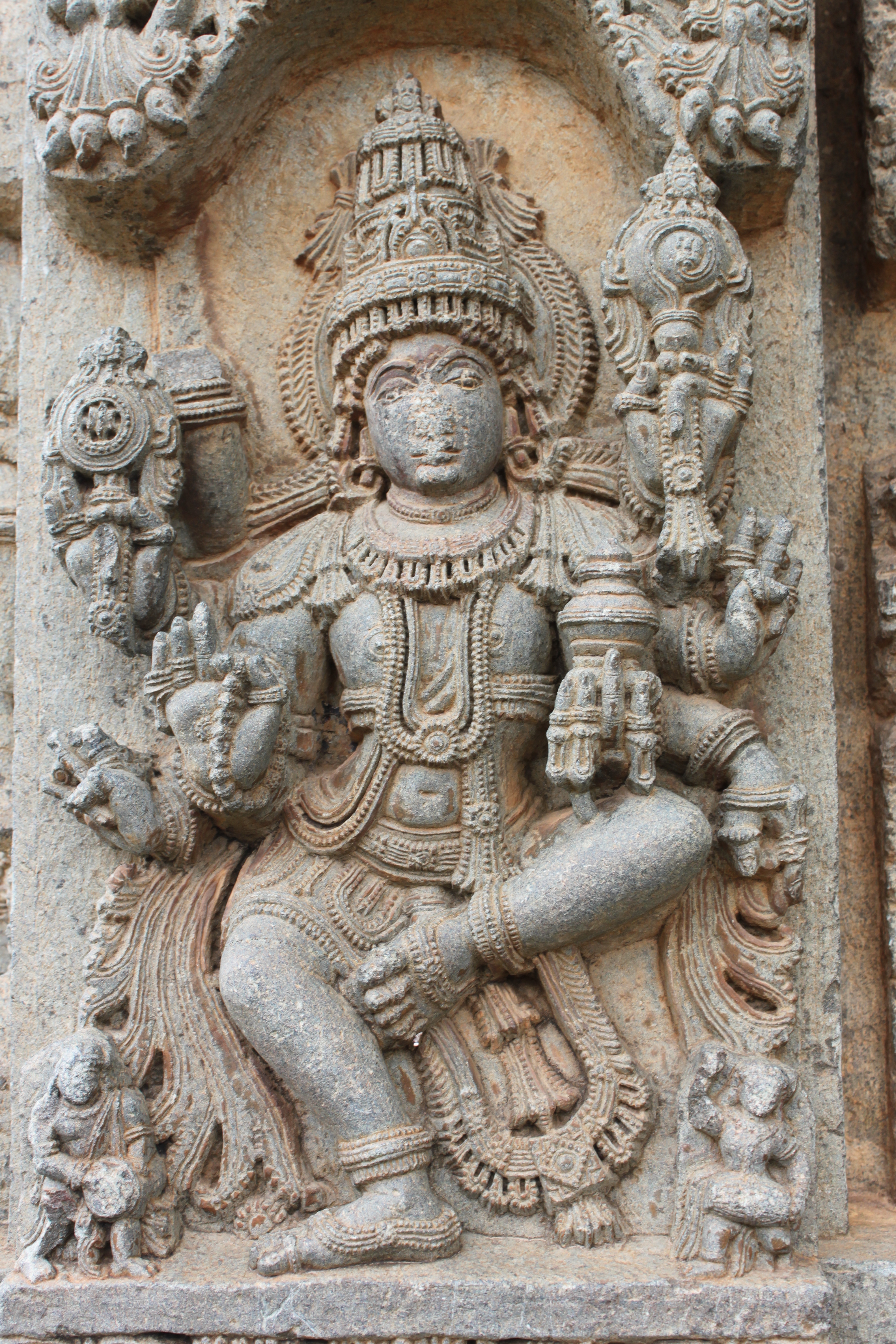 Image courtesy : Saurabh Saxena - https://puratattva.in/ The top two hands of the deity are holding conch and discus, two more are holding prayer beeds and a kamandalu (pot of water). The other two are in a dancing mudra or hand gesture.