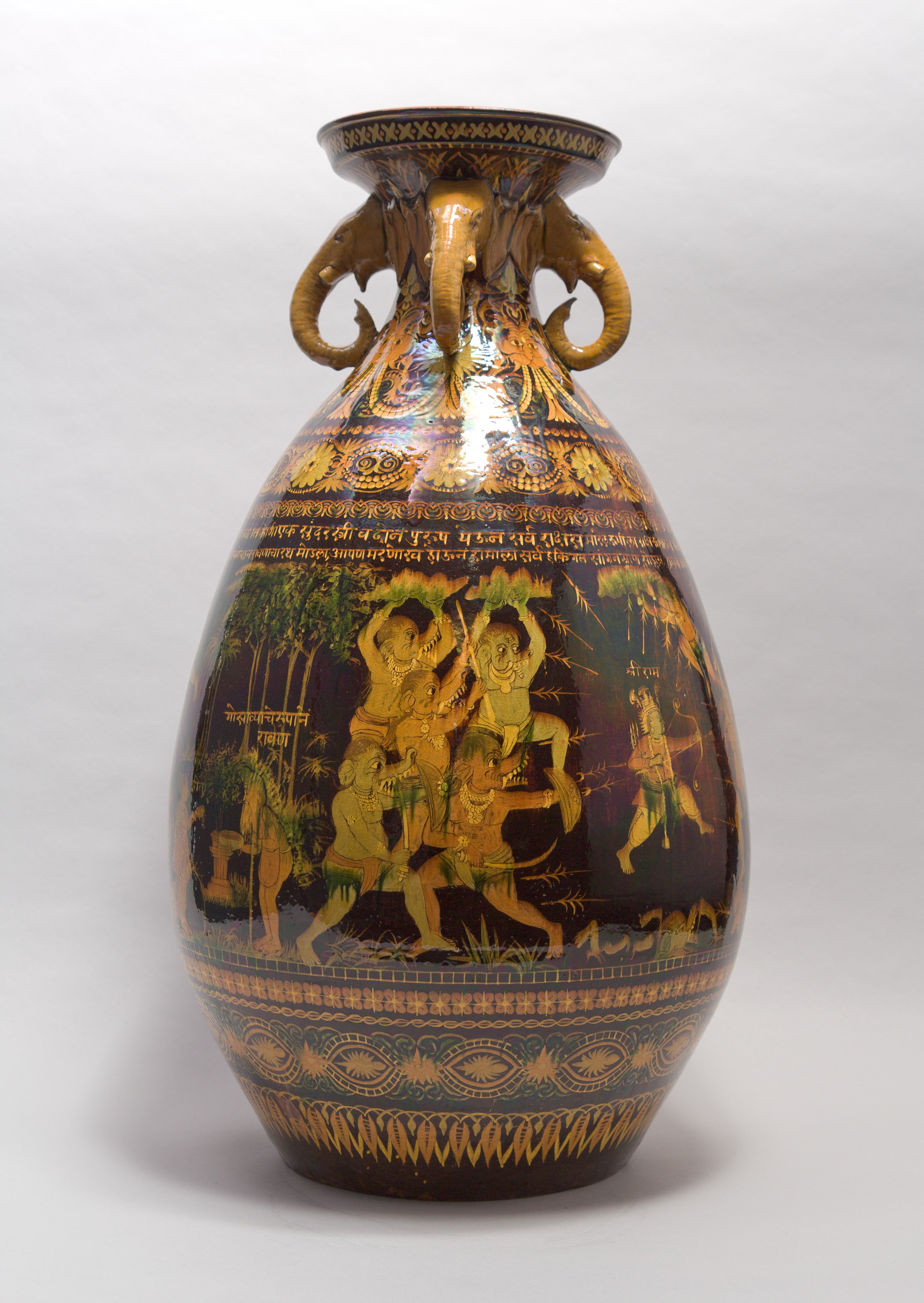 Drawn from the third book (“Aranya Kanda”) of the Ramayana, the elaborate narrative on this vessel depicts key scenes in the Dandaka forest. Created by the Bombay School of Art in an effort to preserve Indian craft, the object features many embellishing motifs drawn from the Buddhist murals of Ajanta. These features include the lotus and pearl band running around the shoulder and the monster faces (kirtimukha), set between the addorsed elephant heads, that spit out a garland of jewels. Although the vase is grounded in the Indian tradition, British neoclassical taste clearly underlies its shape and some of its geometric motifs. Given the scale and inscribed multiscene narrative, this vase may have been produced for the London Colonial and Indian Exhibition of 1886.